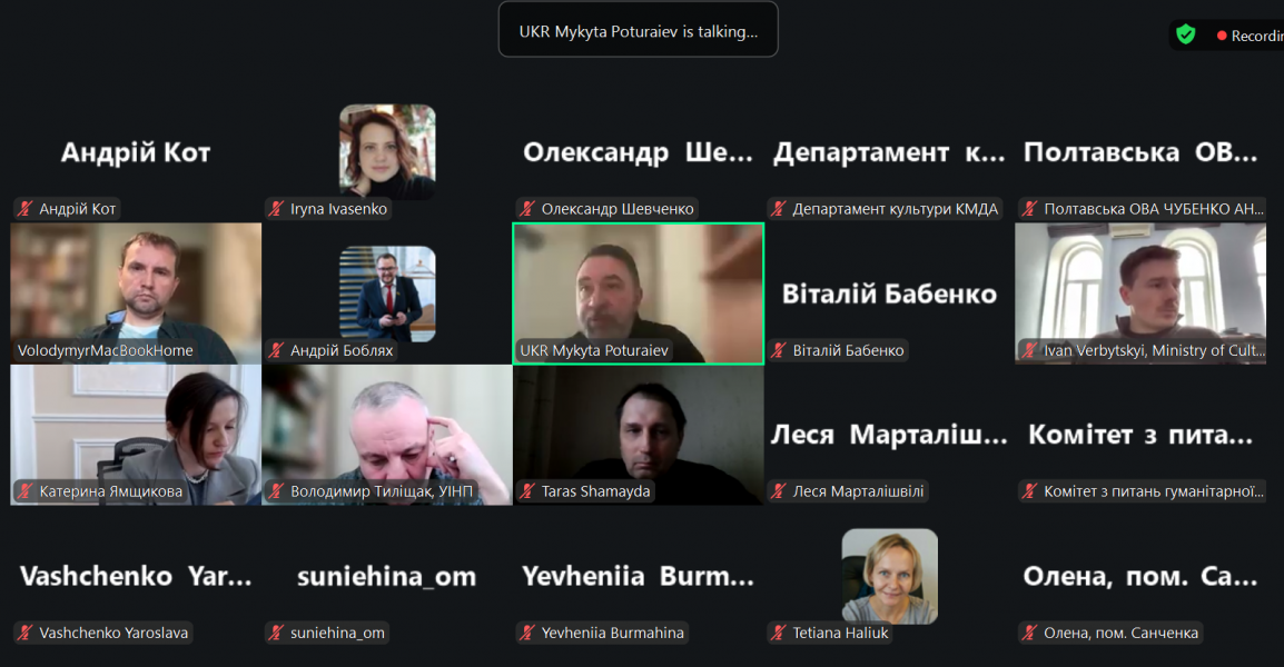 Також Заступниця голови Комітету Євгенія Кравчук звернула увагу на необхідності вже зараз закладати підходи до відновлення культурної сфери після війни: «Ми прекрасно розуміємо всі обмеження воєнного часу, але вже сьогодні маємо працювати над пакетом післявоєнних стимулів. Культура повинна бути повноцінно представлена в процесі відновлення країни — як на національному, так і на регіональному рівнях».